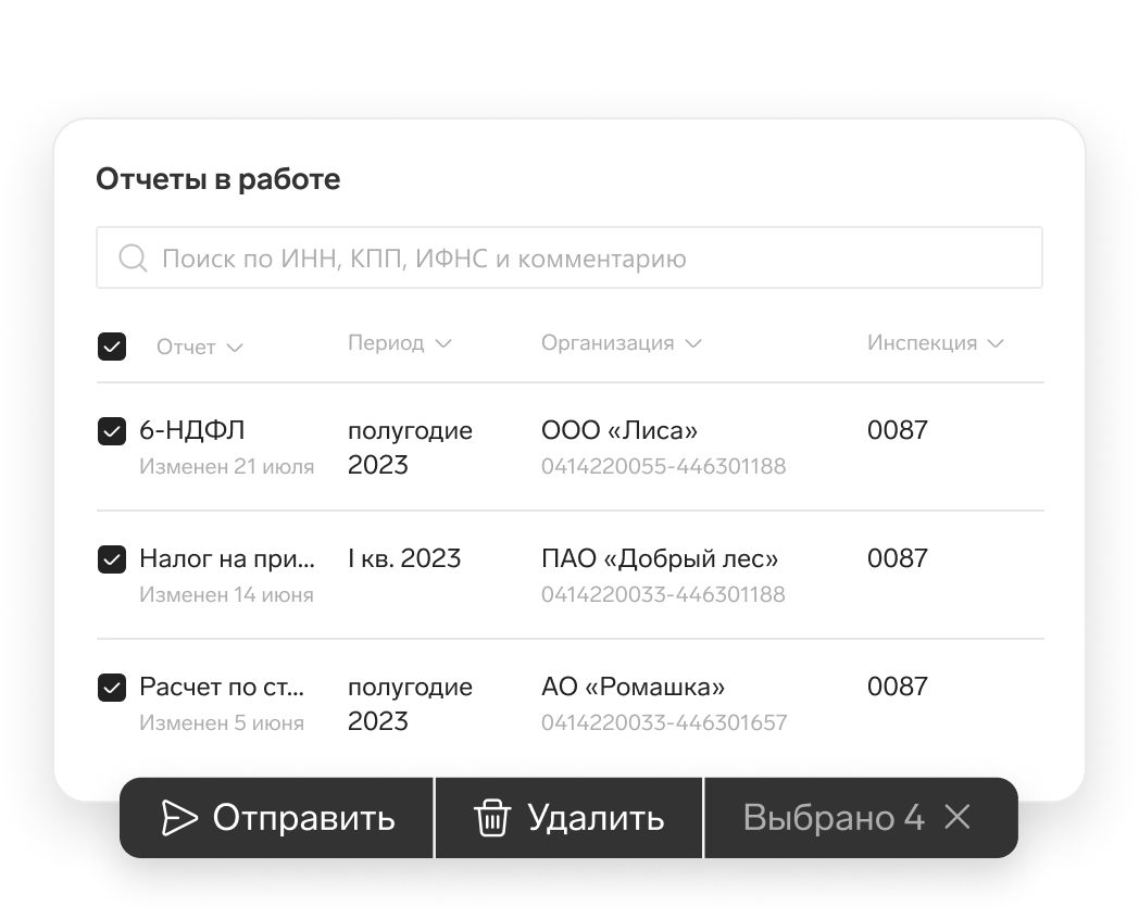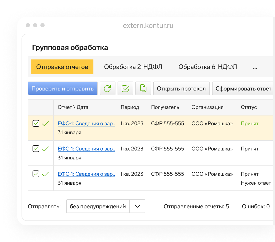 За одну отправку передавайте любое количество отчетов в ФНС и Росстат, а также документов по проактивным выплатам в СФР. Экстерн проверит их на ошибки и для каждого определит, что за отчет загружен, за какую организацию и за какой отчетный период.