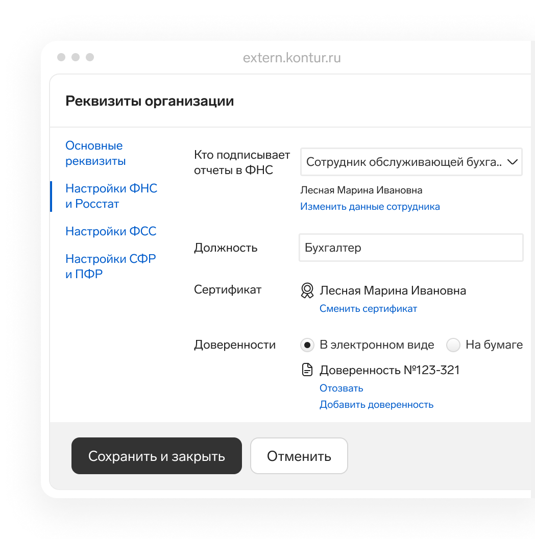 Отчетность в сервисе можно подписывать сертификатами руководителей, сотрудников или физлиц с доверенностями — бумажными и электронными (МЧД). Сформируйте электронную доверенность прямо в Экстерне или загрузите готовый файл.